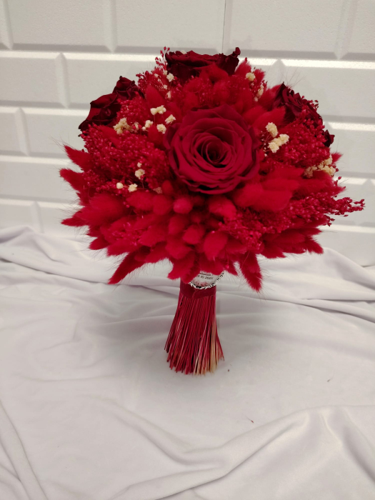 Acest buchet roșu simbolizează dragostea și rafinamentul, completând cu eleganță atmosfera evenimentului tău și oferind un accesoriu vizual spectaculos.