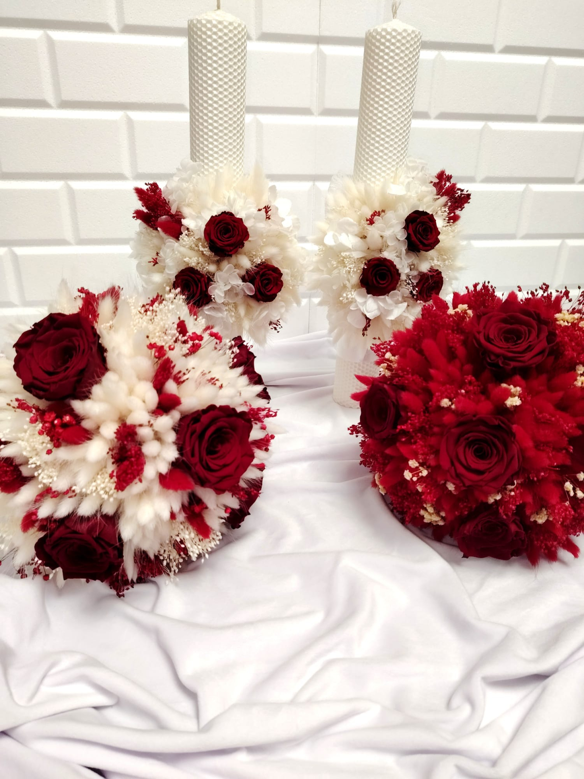 Fiecare set este creat pentru a se integra armonios în decorul nunții, completând perfect buchetul miresei și al nașei. Designul elegant le face ideale pentru ceremonii premium și fotografii memorabile.