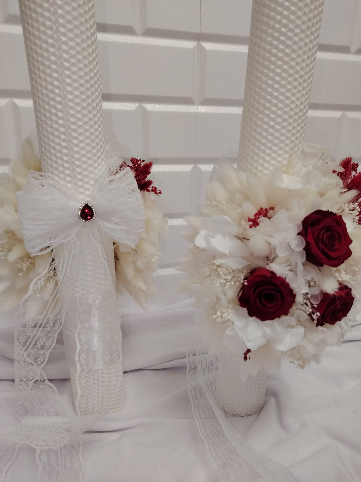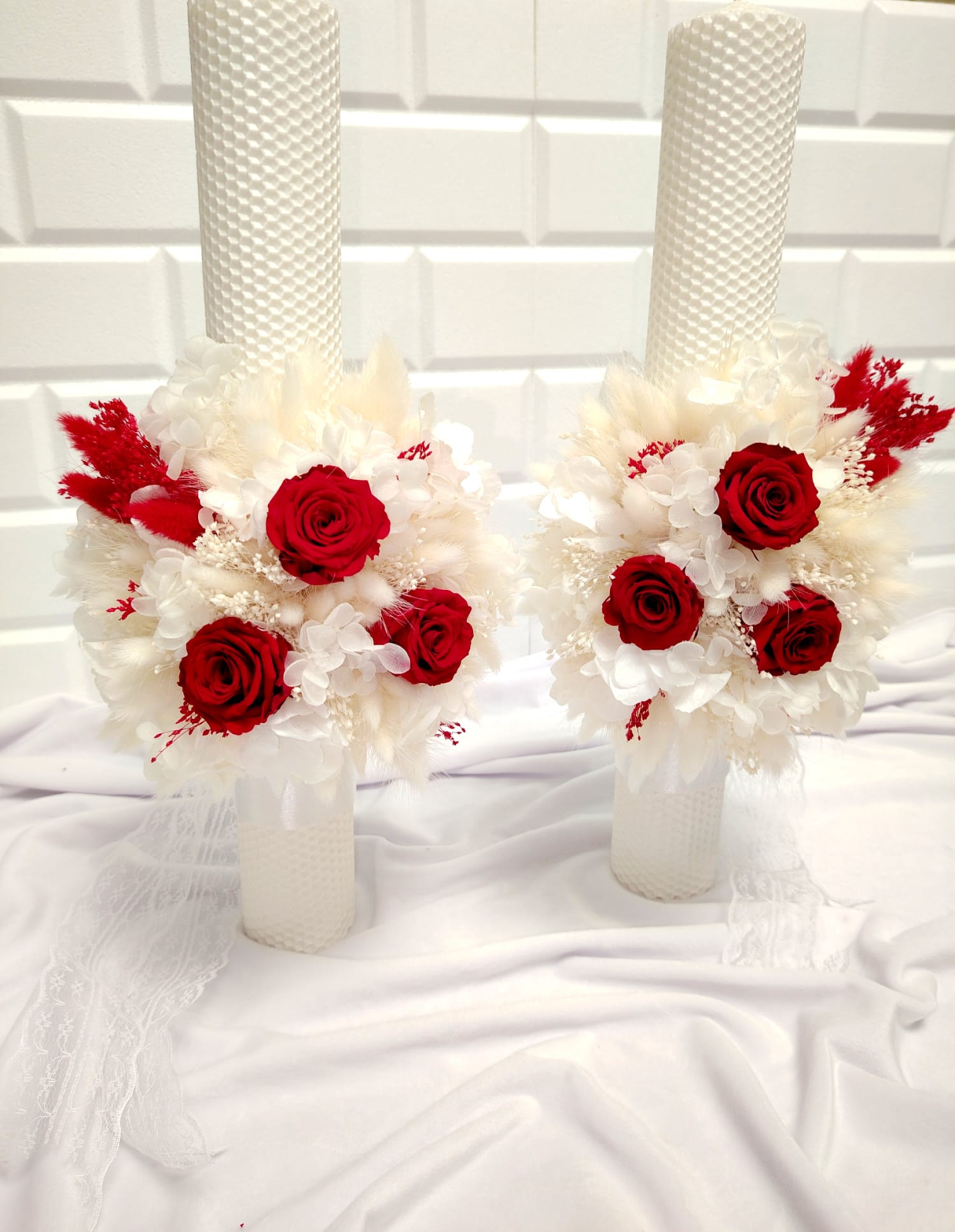 Lumânări de cununie decorate cu trandafiri criogenați, hortensie și plante stabilizate, realizate manual pentru nunți elegante – rafinament premium Amalys Glam Deko.
